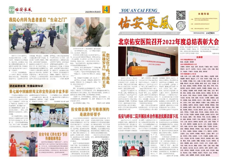北京佑安医院院刊《佑安采风》第296期电子报新鲜出炉啦,这期报纸刊登了北京佑安医院开展学习贯彻习近平新时代中国特色社会主义思想主题教育活动,举办2022年总结表彰大会等新闻,以及医院在党的建设、医院管理、人才培养和医教研防管等各领域的工作、服务群众的新举措新成效等。