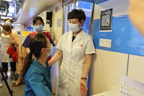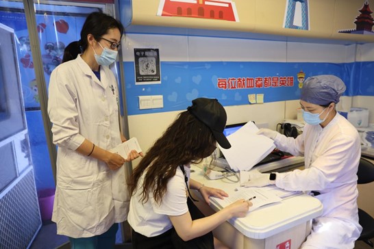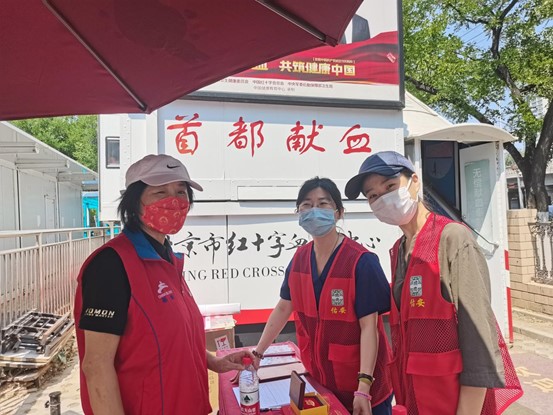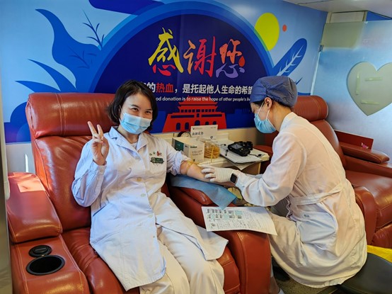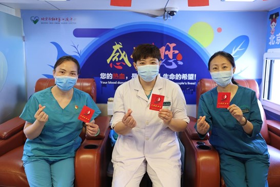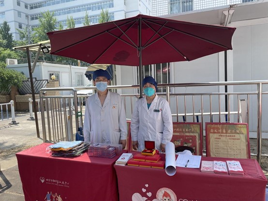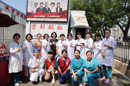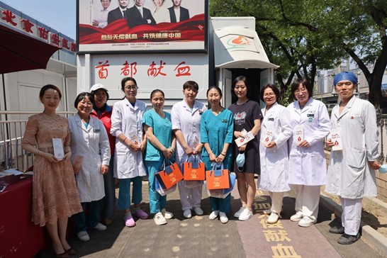 北京佑安医院联合北京市红十字血液中心、丰台区卫生健康委员会、首都无偿献血志愿者协会举办“世界献血者日”无偿献血专场,临检中心党支部、工会社工医患党支部倡议并动员支部及科室医务人员参与无偿献血活动,并为参与人员拍摄照片留念。