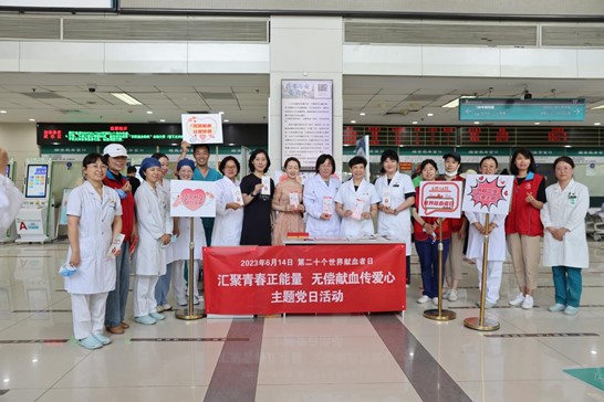 2023年6月14日是第20个“世界献血者日”。为深入学习宣传贯彻党的二十大精神,弘扬医务人员“敬佑生命、救死扶伤、甘于奉献、大爱无疆”的职业精神,大力倡导无偿献血健康文明生活新风尚,营造无偿献血良好社会氛围,发挥党员干部先锋模范带头作用,进一步推动无偿献血工作和医务社会工作健康发展,由北京佑安医院输血科、临检中心党支部主办,联合北京市红十字血液中心社会工作科、丰台区卫生健康委员会、北京佑安医院工会社工医患党支部、北京佑安医院医务社工部、首都无偿献血志愿者协会秘书处圆满开展“汇聚青春正能量 无偿献血传爱心”献血宣传活动暨党支部主题党日活动。丰台区卫生健康委医疗保障科(献血办)吕梅琴老师、首都无偿志愿者协会喻其文老师、北京佑安医院工会主席刘香玉、医务社工部主任张鸣旭、临检中心党支部书记于艳华、临检中心主任娄金丽莅临活动现场。