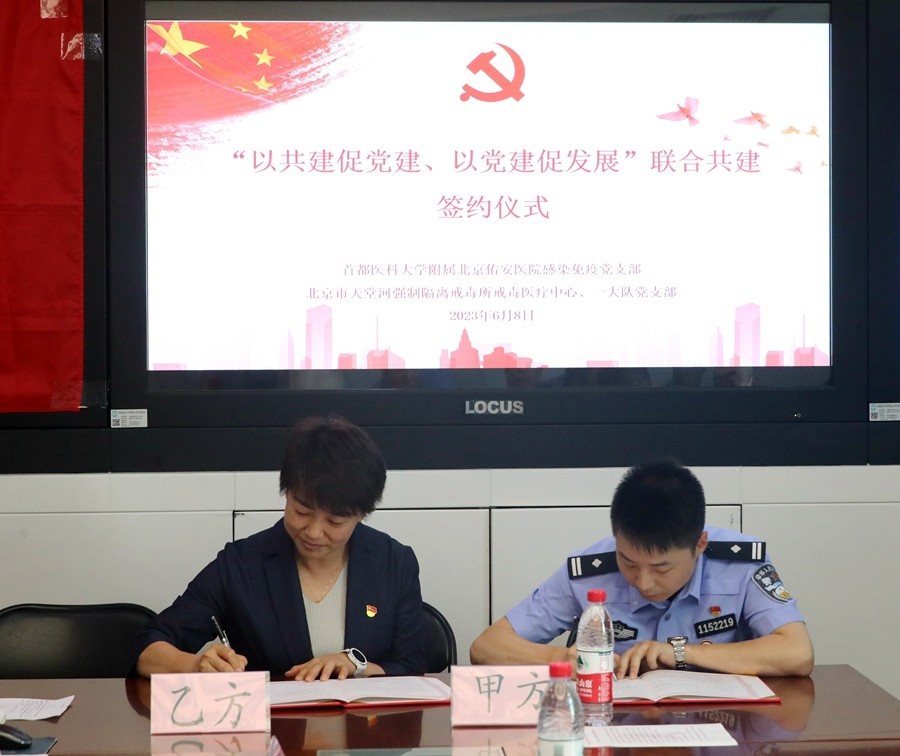 为深入学习贯彻党的二十大精神,持续推进学习教育常态化、制度化,切实加强新时期党建工作,改进组织生活、丰富活动内容、增强活动实效、不断拓宽党建思路,提高党支部的创造力、凝聚力和战斗力,努力形成党建工作新格局,着力探索基层党建工作创新发展之策。2023年6月8日,北京佑安医院感染免疫党支部与北京市天堂河强制隔离戒毒所戒毒医疗中心、一大队党支部联合开展“以共建促党建、以党建促发展”主题党日活动。出席此次活动的有北京市天堂河强制隔离戒毒所戒毒医疗中心党支部书记李宝亮,一大队党支部书记李洋、北京佑安医院党委副书记、纪委书记王建敏、北京佑安医院感染免疫党支部书记张彤,以及各支部党员共30余人。