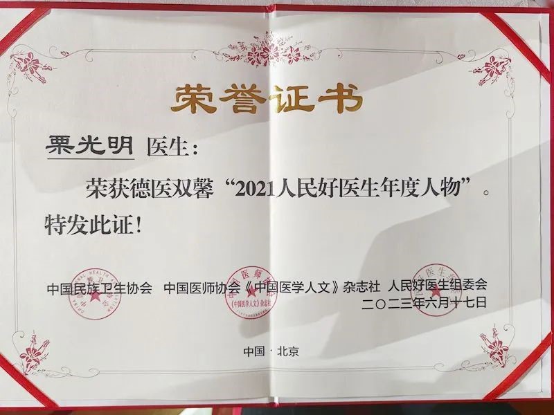 2023年6月17日,第七、八届人民好医生论坛暨《2021~2022人民好医生跟诊记》发布仪式在京举行。北京佑安医院普外中心主任栗光明获2021年度“人民好医生”称号。
