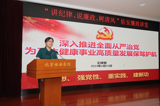为深入开展学习贯彻习近平新时代中国特色社会主义思想主题教育,引导广大党员干部职工进一步强化政治意识、纪法意识、规矩意识和敬畏意识,坚持党性党风党纪一起抓,近日,北京佑安医院纪委开设了“讲纪律、说廉政、树清风”“佑安廉政讲堂”系列课程。6月26日,党委副书记、纪委书记王建敏同志讲授第一课。医院纪委委员、党支部纪检委员、科室党风廉政建设监督员等全体专兼职纪检干部以及妇科党支部、产科党支部、科技纪检党支部等百余名党员干部参加了培训。会议由纪检办公室主任朱晓虹主持。