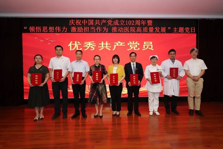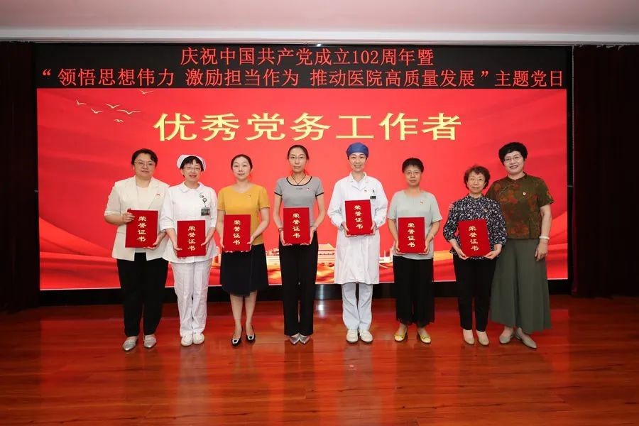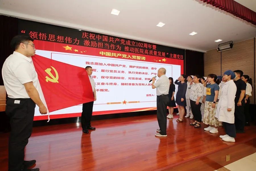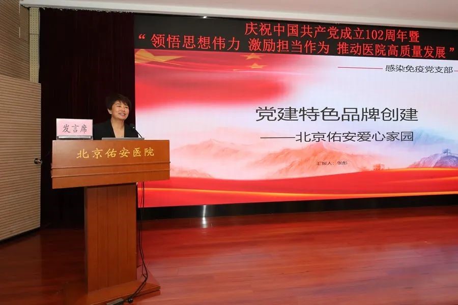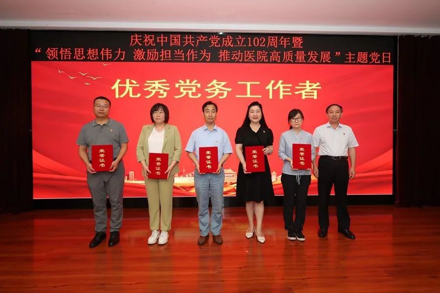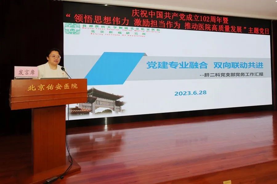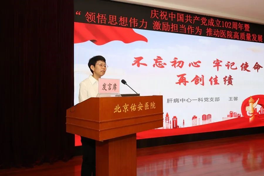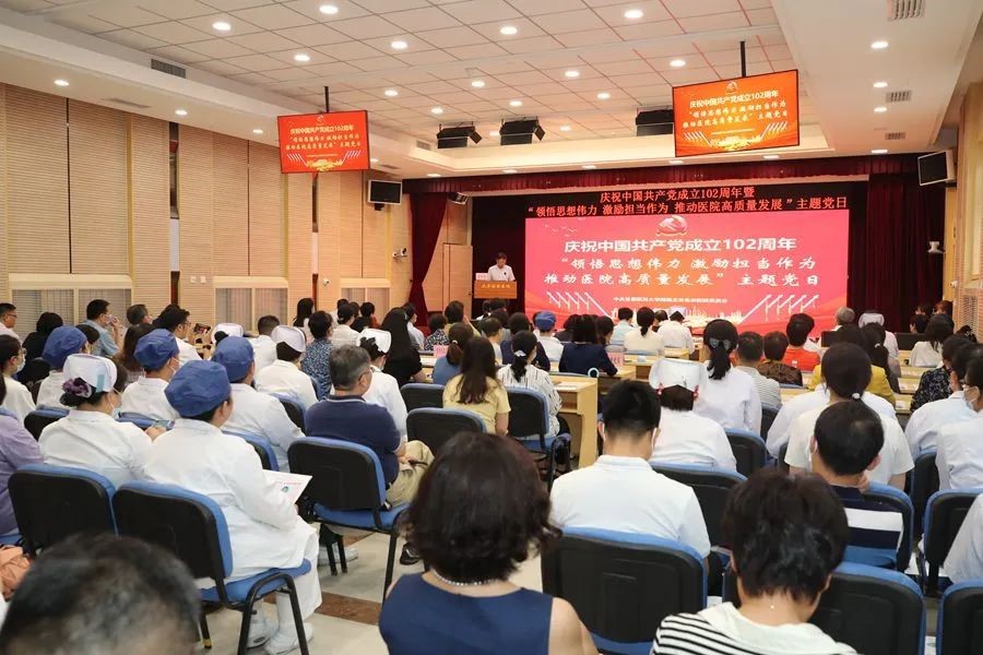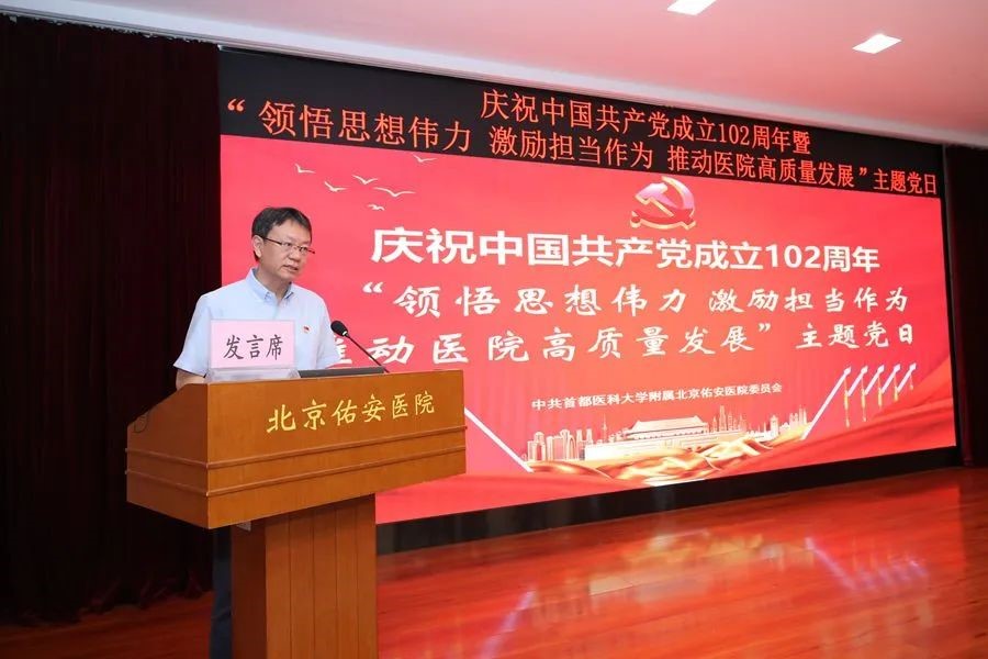 为深入贯彻落实党的二十大精神,推动学习贯彻习近平新时代中国特色社会主义思想主题教育扎实开展、走深走实,北京佑安医院党委于2023年6月28日下午召开庆祝中国共产党成立102周年暨“领悟思想伟力 激励担当作为 推动医院高质量发展”主题党日,医院领导班子、党支部书记、中层干部、“两优一先”代表、党外人士代表、离退休老同志代表、新党员参加。大会由党委副书记、纪委书记王建敏同志主持。