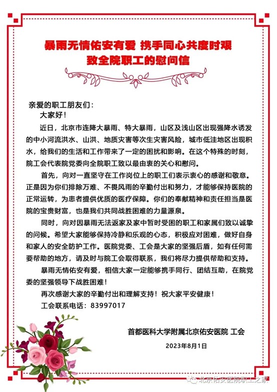 特此,向全院职工发出慰问信,致敬最美佑安人!