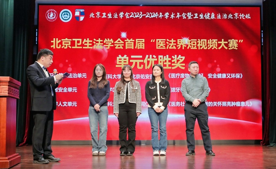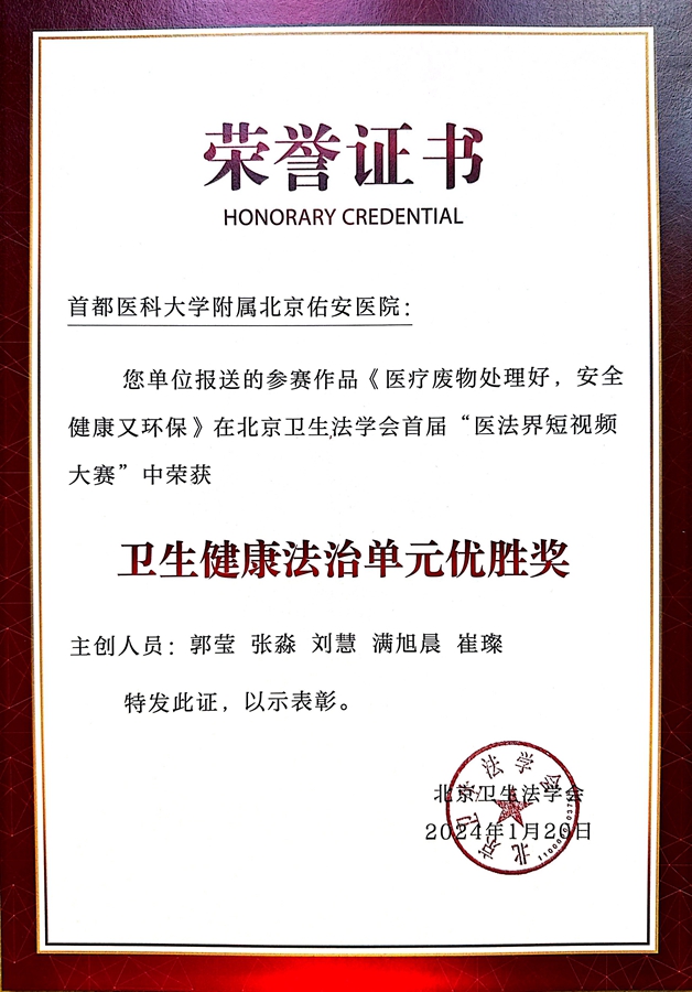 2024年1月20日,由北京卫生法学会主办的首届“医法界短视频大赛”颁奖典礼在京举办。佑安“短视频创作小团队”的《医疗废物处理好,安全健康又环保》的短视频在参赛的32件短视频作品中脱颖而出,最终斩获“卫生健康法治单元优胜奖”的殊荣。