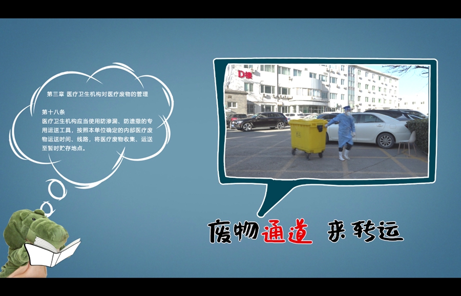 在短视频拍摄的过程中,也得到了总务处的大力支持,北京佑安医院保洁团队实景还原了垃圾处理与院内转运的流程,北京润泰环保科技有限公司为医疗废物清运作业提供了大量制作素材和资料。经过一个月的精心创作与打磨,三分钟的精品小视频《医疗废物处理好,安全健康又环保》终于出炉,在医患关系协调办公室霍宏蕾主任的推举和把关下,成功投送北京卫生法学会首届“医法界短视频大赛”的卫生健康法治主题进行参赛。