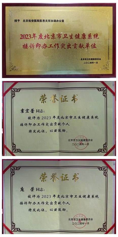 近日,北京市卫生健康委员会组织召开2023年度接诉即办工作总结部署会,通报表彰了全市卫生健康系统接诉即办工作突出贡献单位和先进个人。我院医患办荣获“2023年北京市卫生健康系统接诉即办工作突出贡献单位”,霍宏蕾、庞荣同志荣获“2023年北京市卫生健康系统接诉即办工作突出贡献个人”荣誉称号。