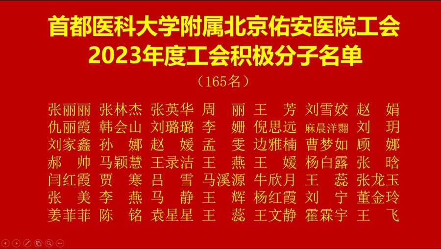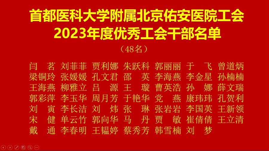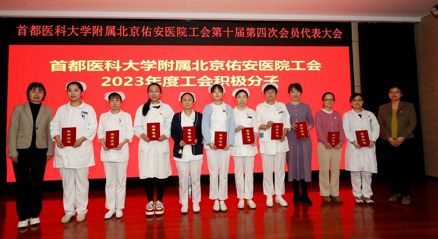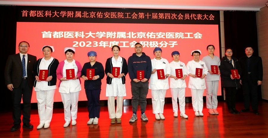 接下来,召开了“首都医科大学附属北京佑安医院工会第十届第四次会员代表大会”。会员代表认真听取了工会负责人向海平副院长作的关于《首都医科大学附属北京佑安医院工会2023年工作报告》,工会财务李卉同志作的关于《首都医科大学附属北京佑安医院工会2023年财务决算报告》,与会代表一致通过审议事项。随后,工会负责人向海平副院长作了关于《首都医科大学附属北京佑安医院第十届会员代表补选情况报告》,工会副主席仇淑华同志宣读了《关于表彰2023年度优秀工会干部和工会积极分子的决定》,院领导向获奖代表颁发了荣誉证书。