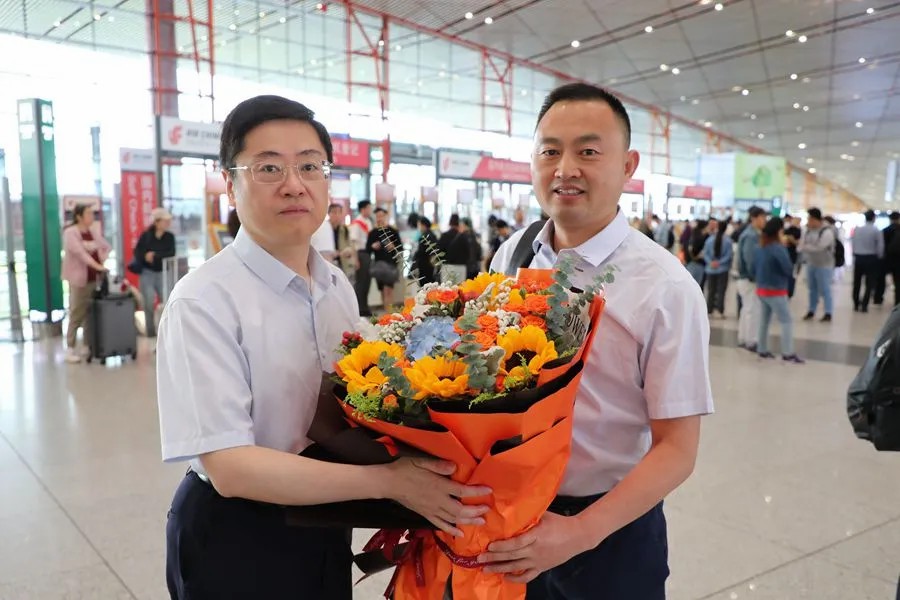 2024年5月21日清晨,北京佑安医院党委委员、副院长胡中杰,医务处处长张月宁,肝病一科党支部委员王征等一行人来到北京首都国际机场欢送援疆干部、肝病中心一科主任医师鲁俊锋出征。鲁俊锋同志作为北京市卫生健康系统2024年援疆医疗队队员将赴和田地区传染病医院挂职副院长执行一年援疆任务。