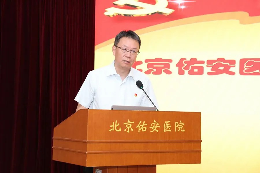 党委书记郑东翔代表医院党委向获得纪念章的老党员表示热烈祝贺。在中国共产党成立103周年之际,向所有老党员、新退休同志及青年团员致以诚挚的问候,对大家为医院发展建设所做的贡献表示衷心感谢。并号召全院党员干部一要向老党员致敬,学习优良传统,传承红色基因;二要持续深化“六好”党支部示范创建,凝聚力量,推动医院高质量发展;三要关心老党员的生活,做好服务保障,共享发展成果。