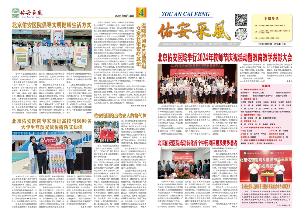 北京佑安医院院刊《佑安采风》第316期电子报新鲜出炉啦!这期报纸展示了我院庆祝教师节、开展科技成果转化、加强联盟医院合作以及医教研防管等工作开展的相关内容,服务群众的新举措、新成效等。以报为媒,搭建医患沟通的桥梁和纽带。