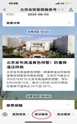 1. 登录微信公众号“北京佑安医院服务号”,选择“就诊服务”。