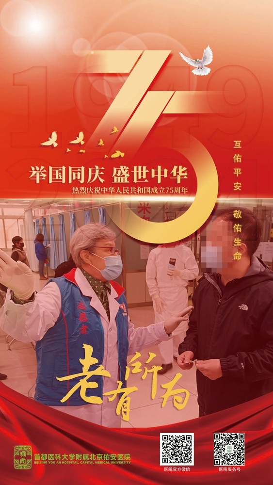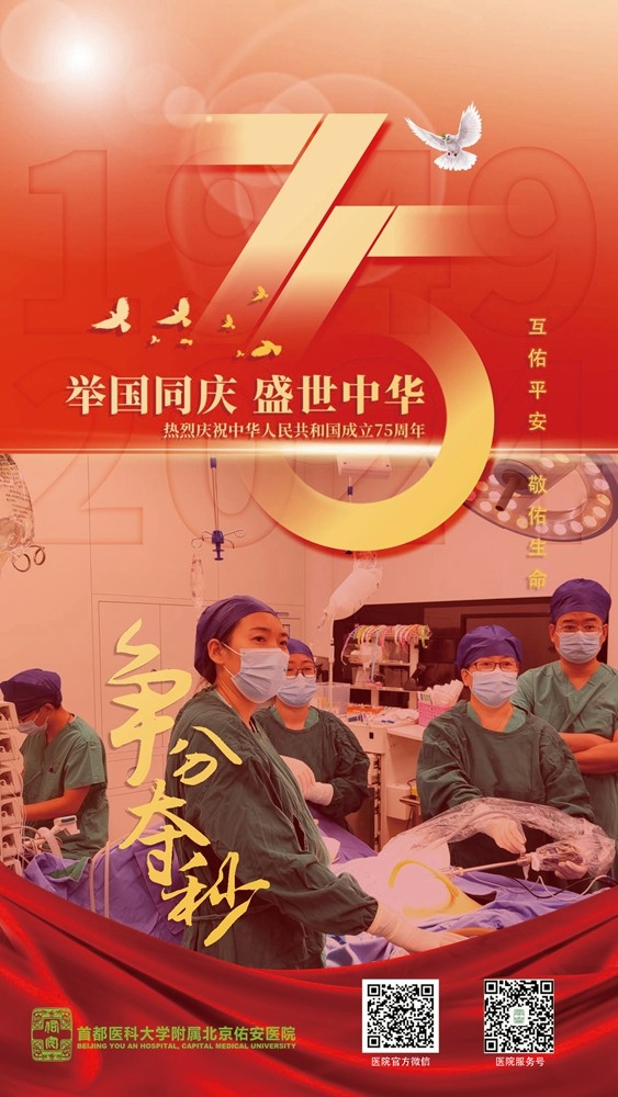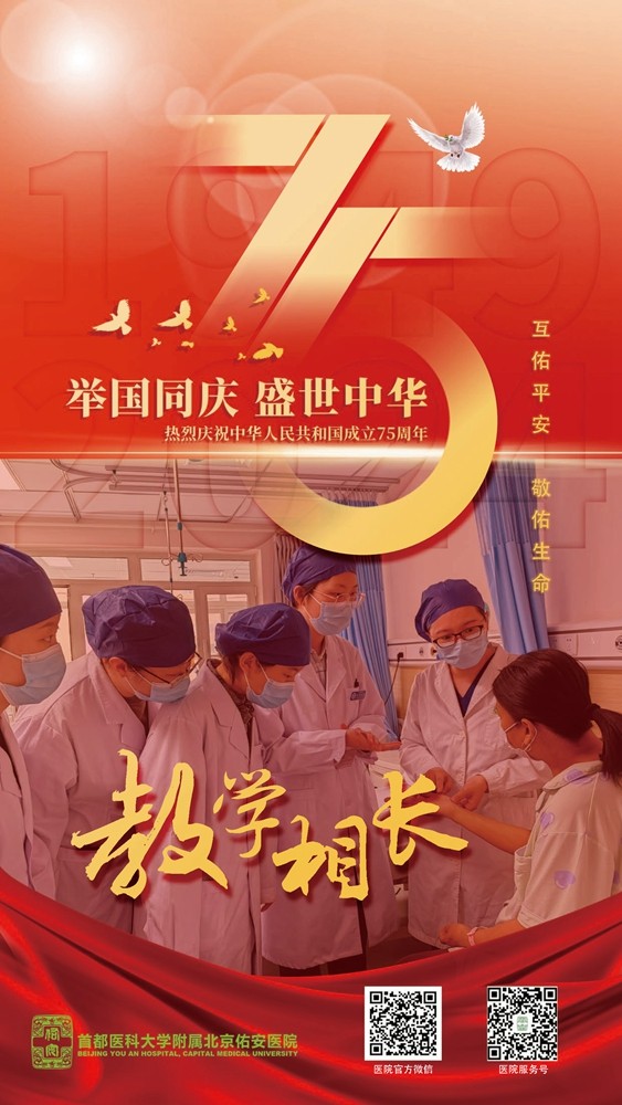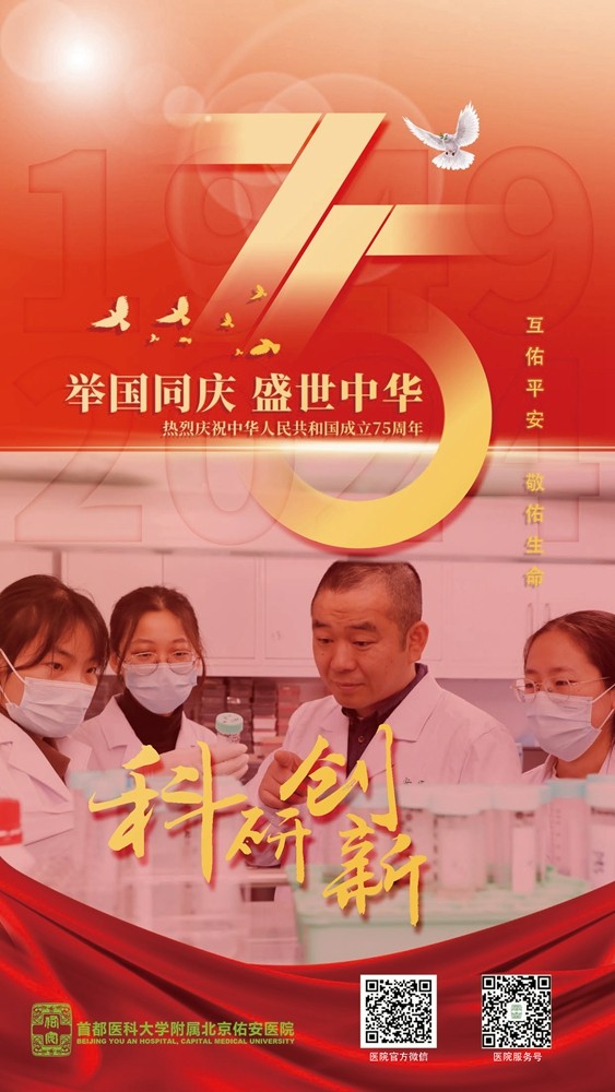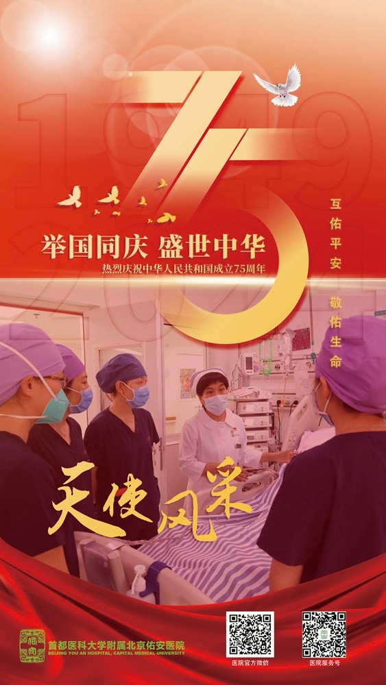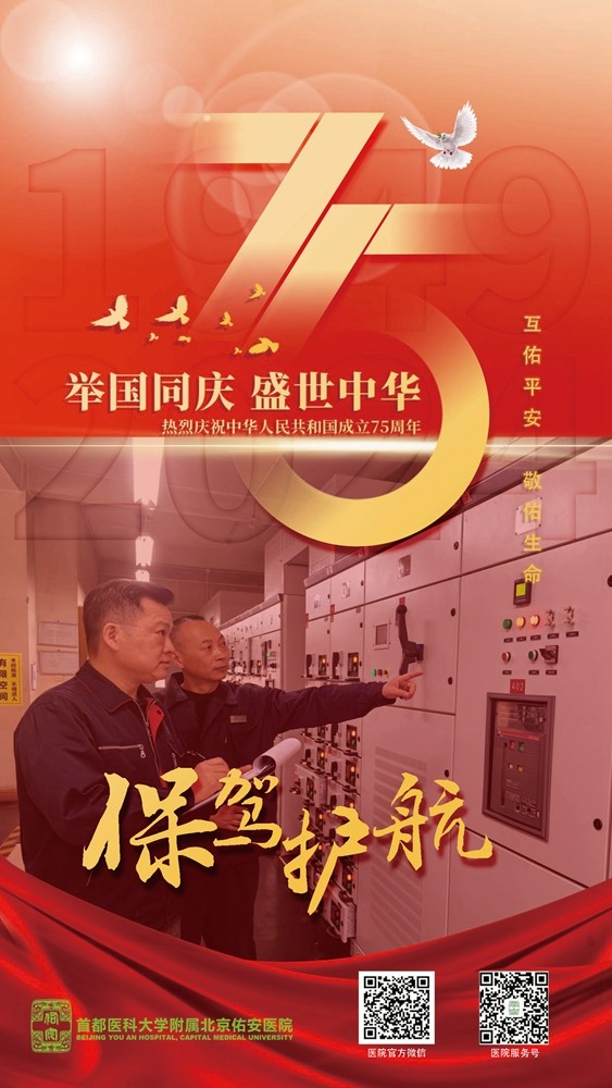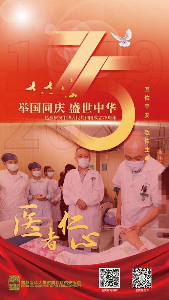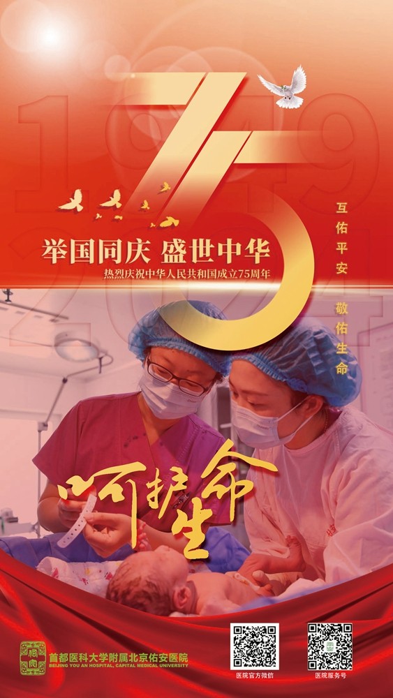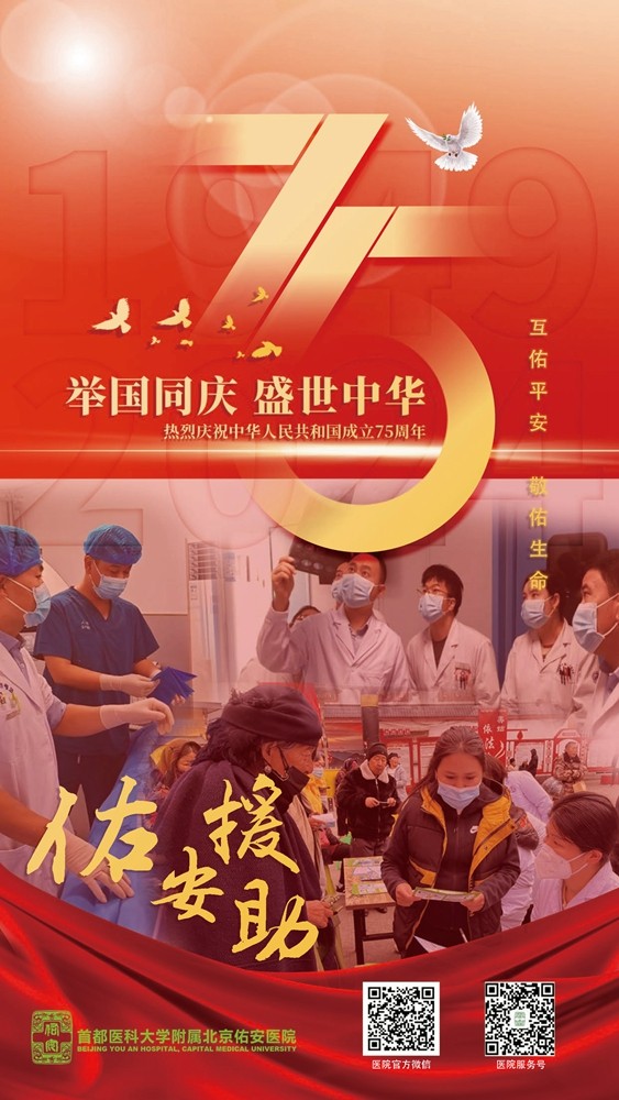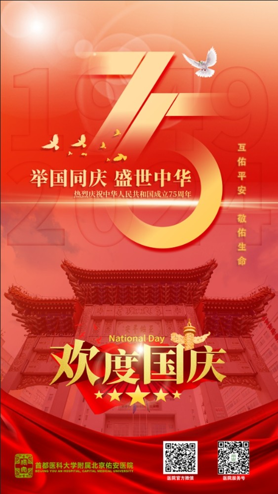 在中华人民共和国成立75周年之际,首都医科大学附属北京佑安医院送上最真挚的祝福。祝福祖国繁荣昌盛!祝福人民健康平安!祝福医疗卫生事业不断进步!