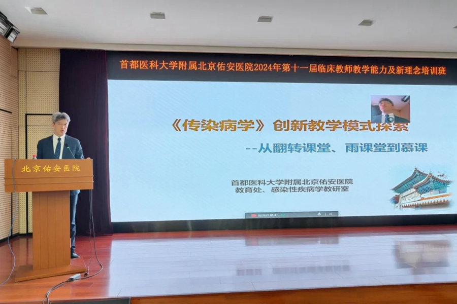 教学相长再创佳绩,圆满完成中英文《传染病学》、《临床医学概论》和护理专业等线下线上3704课时的教学任务。呼吸道新发感染病虚拟仿真实验教学系统的建设与应用课题获得2024年度首都医科大学教育教学成果二等奖;获新遴选教师26人,新增硕导4名,博导1名,获批各级教学类课题11项,荣获北京市教学比赛、首医教学奖项共4项。举办2024年第十一期《临床教师教学能力及新理念培训班》,培训首都医科大学各附属医院、教学医院教师100余名;传染病学一流课程建设经验在中华预防医学会感染性疾病学防控分会2024年学术年会暨第七届感染学术会议中的医学教育会上展示推广。