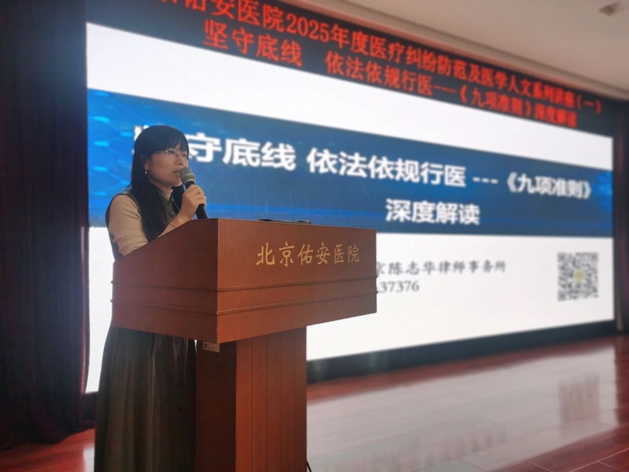 2月21日下午,北京佑安医院举办2025年医疗纠纷防范及医学人文系列讲座的第一场培训活动。本次活动邀请北京陈志华律师事务所主任陈志华律师,围绕《九项准则》以及法律应对策略进行深入解读。胡中杰副院长、医务处处长张月宁、纪检办主任朱晓虹、以及全院各科室主任、副主任、护士长、投诉纠纷协调员、医务社工之友、行风监督员、党风廉政建设监督员共计100余人参加了本次培训活动。此次培训吸引了全院各科室的骨干医务人员踊跃参与,现场学习氛围浓厚。