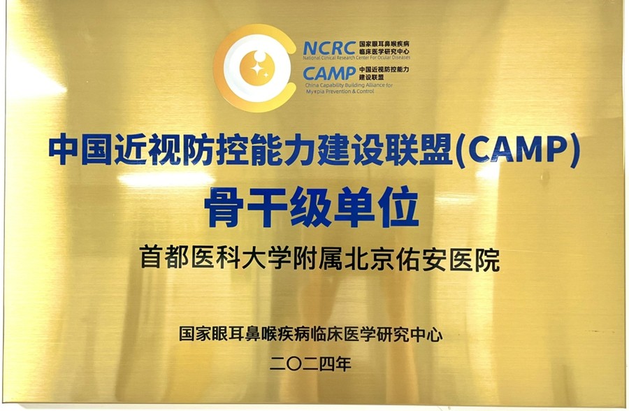 近日获悉,北京佑安医院眼科日前正式获批中国近视防控能力建设联盟(CAMP)骨干级单位(全国仅有160家骨干级单位)。