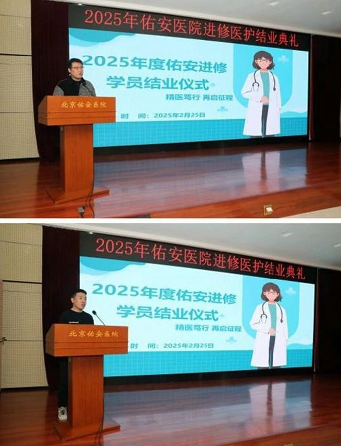 2025年2月25日,北京佑安医院学术报告厅庄重而喜悦,2024 - 2025年度进修医师结业仪式在这里盛大举行。党委副书记、院长马迎民,党委委员、副院长张永宏,教育处处长崔丹,护理部主任张莉莉等领导出席典礼,与来自五湖四海的进修医护人员齐聚一堂,共同为这段充实的进修时光画上圆满句号,开启医疗事业新征程。
