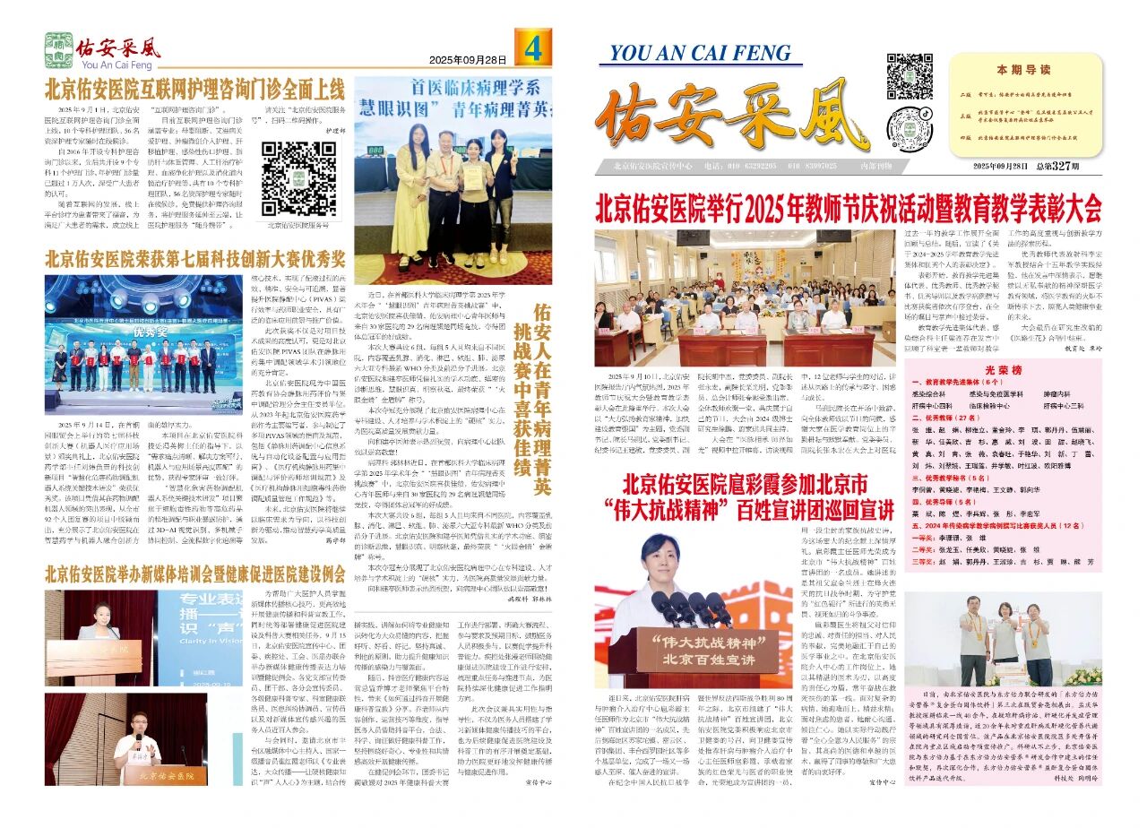 翻开2025年第327期《佑安采风》,每一篇文章、每一幅图片都记录了北京佑安医院在党建引领、医教研防等各项工作取得的成绩和精进诊疗、服务患者的新举措、好成效。充分展现了佑安人勇于创新,甘于奉献的职业精神。