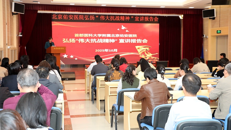 为深入学习贯彻习近平总书记关于传承和弘扬伟大抗战精神的重要指示精神,进一步激发全院职工的爱国热情和工作动力,10月15日下午,北京佑安医院党委举办弘扬“伟大抗战精神”宣讲报告会。医院领导班子、中层干部、护士长、党支部委员、党外代表人士130余人参加,会议由医院党委副书记、纪委书记王建敏同志主持。