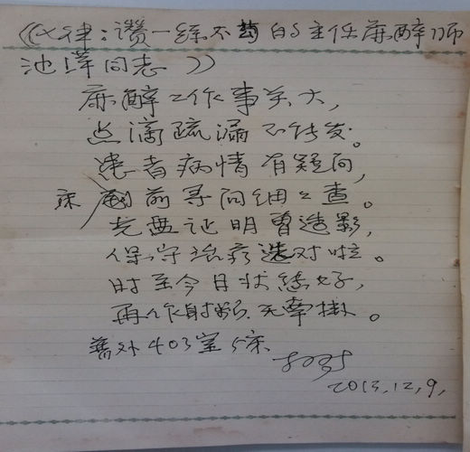 赞一丝不苟的麻醉师池萍主任: 麻醉工作事关大, 点滴疏漏不能发。 患者病情有疑问, 床前询问细细查。 光盘证明曾造影, 保守治疗选对啦。 时至今日状态好, 再作射频无牵挂。 普外403室5床 杨国琛 赞…【详细】