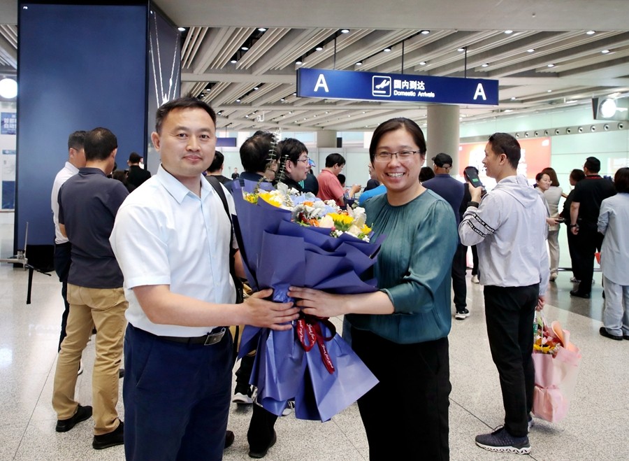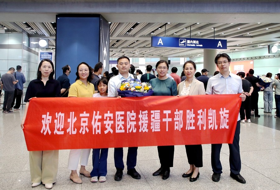 2025年5月25日晚,北京佑安医院援疆干部、肝病中心一科主任医师鲁俊锋圆满完成北京市第十一批第二期援疆任务载誉而归。在院党委的高度重视和关怀下,党委副书记、纪委书记王建敏带队,党委办公室主任张晓静、医务处副处长郭彩萍、肝病中心一科党支部委员王征及其家人到机场迎接鲁俊锋同志凯旋,并送上鲜花致以敬意和问候。援疆期间,他带着佑安人的专业与担当,为新疆地区人民健康投入心血、付出努力、挥洒汗水,充分发挥桥梁纽带和“传帮带”作用,也为民族团结做出了积极贡献。