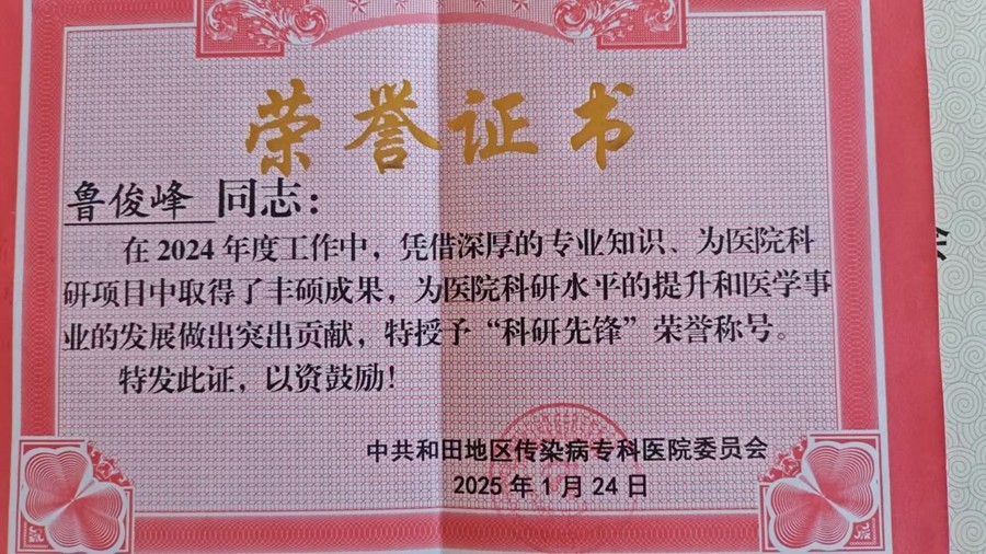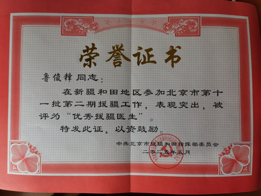 援疆期间,鲁俊锋同志荣获2025年北京市援疆和田指挥部“优秀援疆医生”、2025年和田地区传染病专科医院“科研先锋”、2025年和田地区干部人才考核“优秀”。