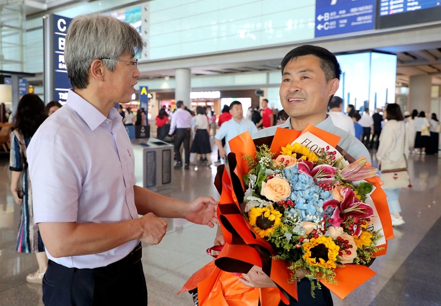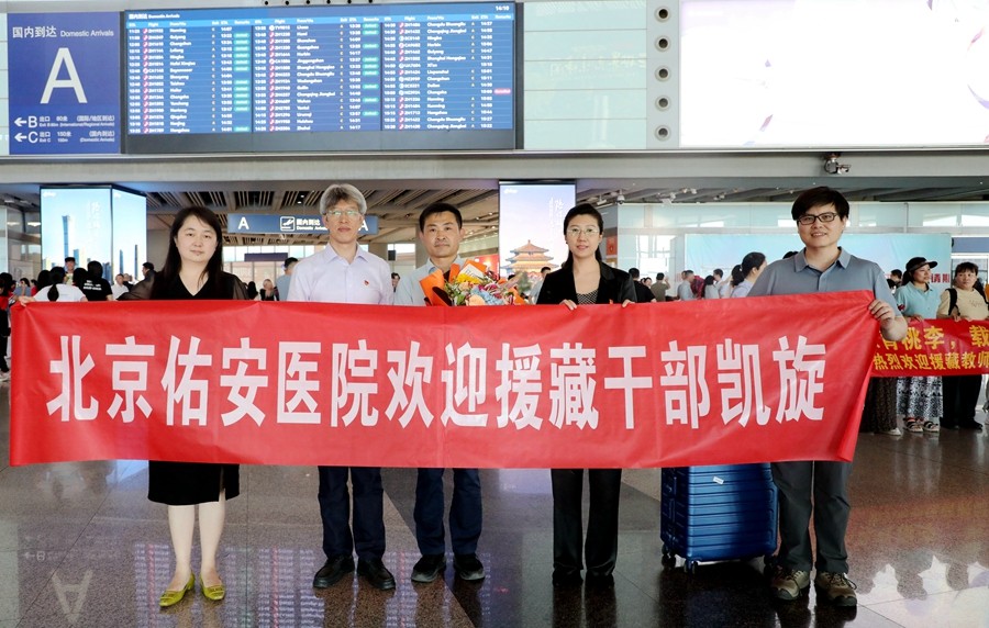2025年7月17日下午,北京佑安医院援藏干部、肝病与肿瘤介入治疗中心副主任医师生守鹏圆满完成北京市第十批医疗“组团式”援藏任务凯旋归来。在院党委的高度重视和关怀下,党委委员、副院长张永宏带队,党委办公室副主任杨仕杰、医务处副处长张嫄、肝病与肿瘤介入治疗中心医师高文峰到机场迎接,并送上鲜花致以敬意和问候。