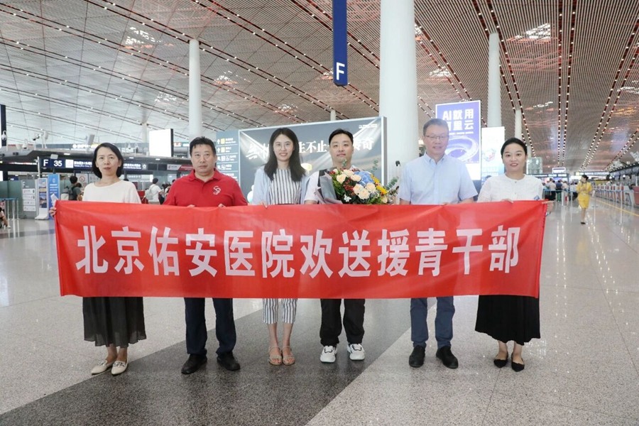 7月27日上午,北京佑安医院党委书记郑东翔、党委办公室、医务处、所在科室负责人以及家属等一行人来到北京首都国际机场,欢送肝病消化中心闫一杰作为北京市卫生健康系统第六批援青干部人才赴青海省玉树州人民医院执行援助任务。