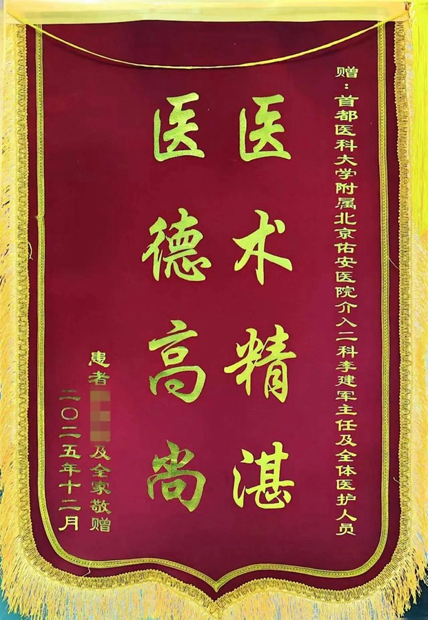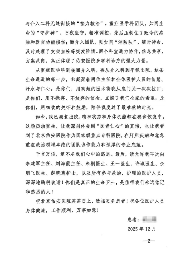 12 月10日,患者终于从反复大量出血的阴霾中走出。从多次生死边缘到平稳出院,出院之际,患者和家属送上了一面写有“医术精准 医德高尚”的大红锦旗,还有一封情真意切的感谢信。