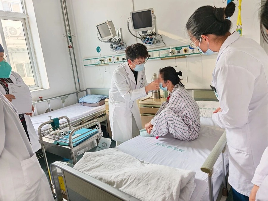床旁阶段(约20分钟): 在充分获得患者知情同意,尊重患者、保护隐私的前提下,主管规培医师徐芳进行了精炼、重点突出的病史汇报。主查医师姜太一主任引导规培医师徐芳及王宇豪进行眼部及呼吸系统重点体格检查,并亲自示范了与患者的沟通技巧,将医学人文关怀自然融入诊疗过程。责任护士从护理角度补充了患者生命体征与病情动态,体现了医护一体化协作。
