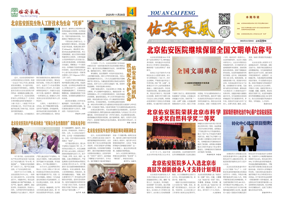 翻开2025年第329期《佑安采风》,每一个故事,每一组图片都展示了佑安医院在党建引领、医院建设、医教研防等各项工作取得的成绩和服务患者的新举措、好成效。全国文明单位称号、市级科学技术奖、国家级肝癌转化治疗中心、党委、工会、退休干部培训等等,这些都充分展现了佑安人勇于创新、甘于奉献、向善向上的职业精神。