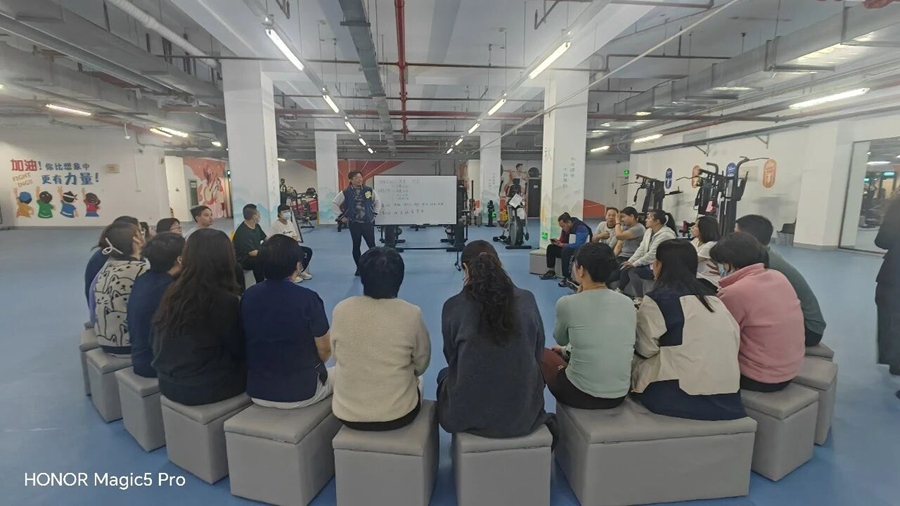 随后,特邀来自管理三联合分会医学工程处的健身达人徐立冬老师闪亮登场,徐老师带来了干货满满的健身分享,他结合自身经验,用生动易懂的语言,从科学健身的核心理念,包括:健身的目的、健身的分类、有氧训练和力量训练的区别、减脂的基本逻辑以及综合器械架的功能和使用方法等等,适合零基础人群的日常健身小技巧以及安全训练多方面进行分享,重点纠正了“盲目锻炼”的误区,为大家带来了一套接地气、易操作的健身指南。